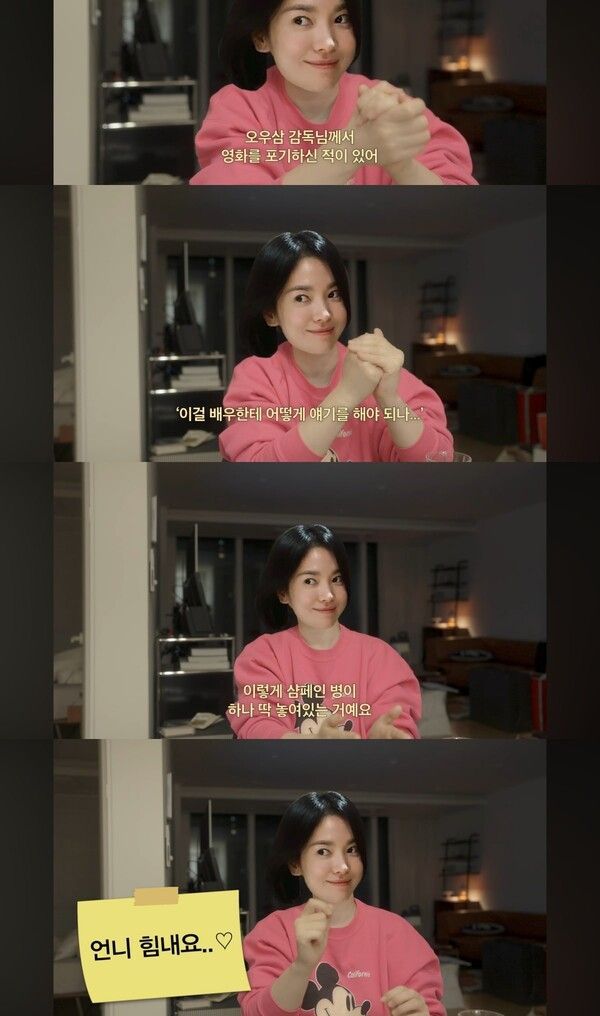 당시 송혜교는 대표의 고백을 듣고 “알겠다”며 흔쾌히 수긍했고, 이후 대표를 위로하기 위해 샴페인과 함께 “언니, 힘내요”라는 메시지가 담긴 포스트잇을 준비했다.