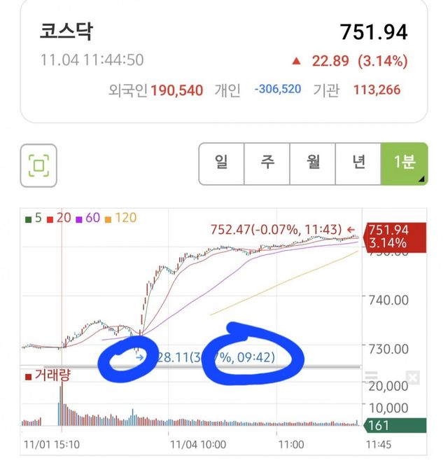 9시 42분에 저점찍고 속보 이후에 기가막힌 매수세로 코스닥 3%급 반등
