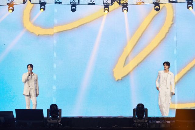 포문은 ‘K팝 간판 그룹’ 동방신기가 열었다. 와이드한 전면 스크린에 붉은 태양이 떠올랐고, 이후 무대에 등장한 동방신기 유노윤호·최강창민은 대표곡 ‘라이징 선’을 열창하기 시작했다. ‘폭발적’이란 단어 하나로는 표현이 안 될 정도로 굉장한 에너지를 발산하며 고척돔에 모인 2만 관객을 뜨겁게 몰아쳤다. ‘K팝 근본 그룹’답게 라이브, 퍼포먼스 모두 흠 잡을 데 없었다. 특히 해맑은 미소를 지은 채 폭룡하듯 고음을 내지르는 최강창민의 모습에선 전율까지 느껴졌다.