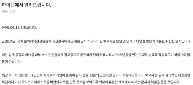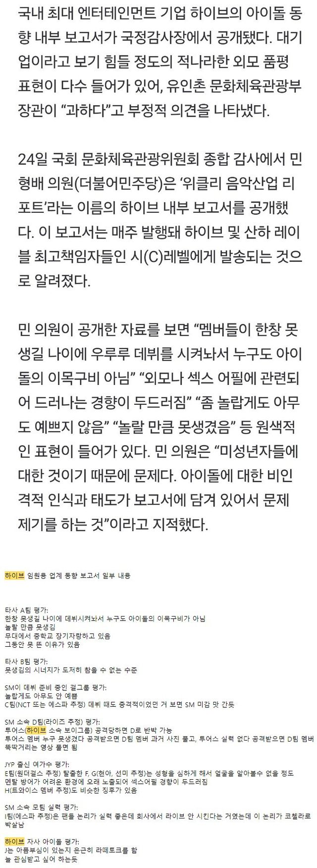 국감에서 공개된 하이브 내부 보고서 내용 수준