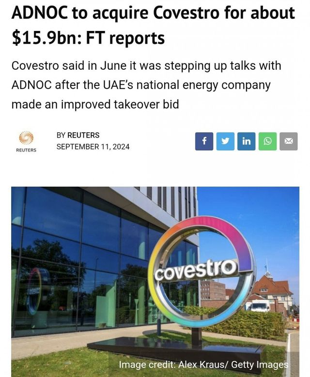 실제로 아랍에미리트 ADNOC은 독일 화학기업인 코베스트로 인수합병 시도 중이고.