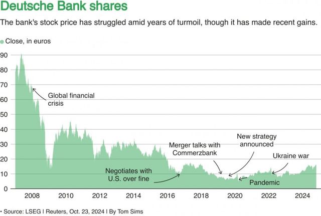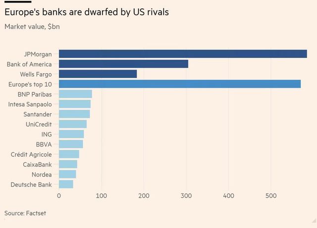 [ 한 때 유럽은 물론 세계 최대 은행중 하나였으나 굴러떨어진 도이체 방크와 유럽 10대 은행의 합보다 커진 전 라이벌 JP 모건 시가총액 ]