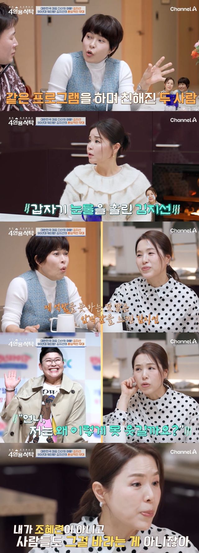 지난 13일 방송한 채널A 예능 '절친 토큐멘터리–4인용식탁’(이하 '4인용 식탁')에서는 김지선이 출연, 그의 절친 변기수, 김효진, 조혜련과 한끼 식사를 했다.