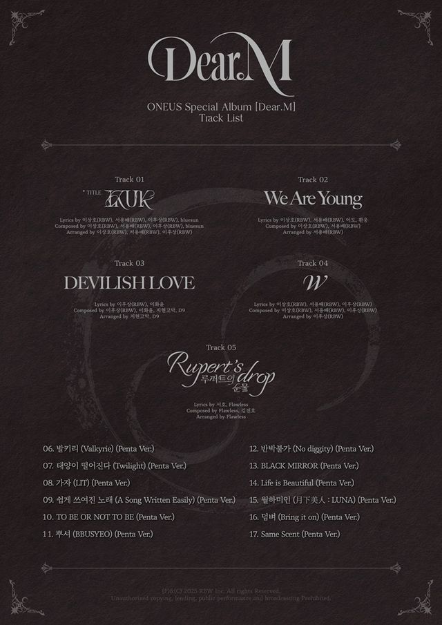 이 외에도 'Dear.M'에는 끝나지 않을 우리의 청춘을 써 내려가는 'We Are Young', 발버둥 칠수록 더 깊이 빠져드는 사랑 이야기를 담은 'DEVILISH LOVE', 늘 그 자리에서 함께해 주는 고마운 이를 향한 마음을 섬세하게 그린 'W' 등 신곡 4곡과 팬송 '루퍼트의 눈물 (Rupert's drop)', 역대 타이틀곡의 재녹음 버전까지 총 17곡이 수록됐다. 멤버 이도와 환웅이 'We Are Young'의 작사에, 서호가 '루퍼트의 눈물 (Ruperts's drop)' 작사에 참여해 음악적 역량을 발휘했다.