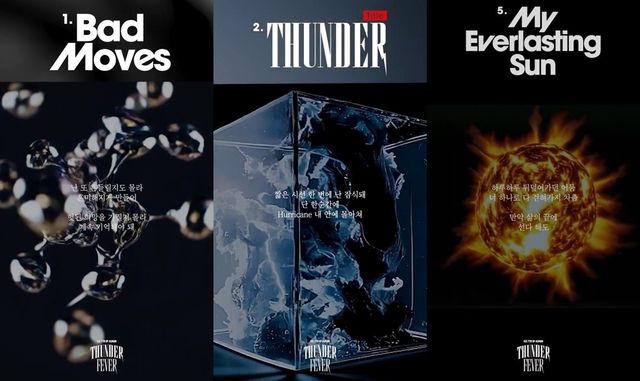 먼저 타이틀곡 ‘THUNDER’는 뇌리를 자극하는 사랑을 천둥번개에 빗댄 전개와 귀에 박히는 비트로 중독성을 자아낸다. CIX는 “짧은 시선 한 번에 난 잠식돼. 단 한순간에 Hurricane 내 안에 몰아쳐. 뇌리를 스친 예감이. 거세게 내몰린 감정이. 날 집어삼켜 폭우로 넌 덮쳐. When I feel the Thunder” 등 강렬한 가사를 표현하며 폭발적인 완전체 에너지를 보여줄 예정이다.