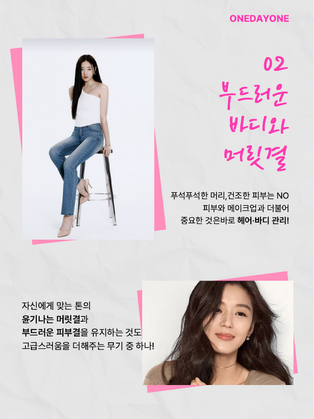 부드러운 머릿결과 자신에게 맞는 톤의 헤어 컬러. 매끄러운 바디 피부를 유지하는 것은 귀티 나는 분위기를 형성하는 무기 중 하나이다.