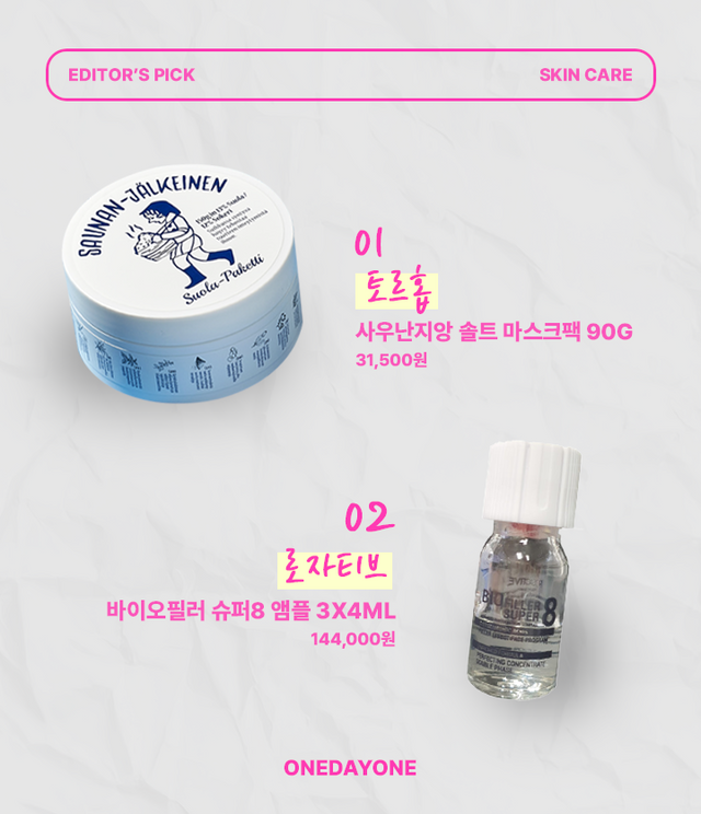 맑고 깨끗한 피부를 만들어 줄 에디터 Pick 화장품 추천 제품은 토르홉 사우난지앙 솔트 마스크팩과 로자티브 바이오필러 슈퍼8 앰플이다.