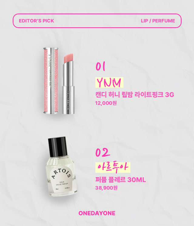 고급스러운 이미지를 위한 에디터 Pick 립 & 퍼퓸 추천템은 YNM의 캔디 허니 립밤 라이트핑크와 아르투아의 퍼퓸 플레르이다.