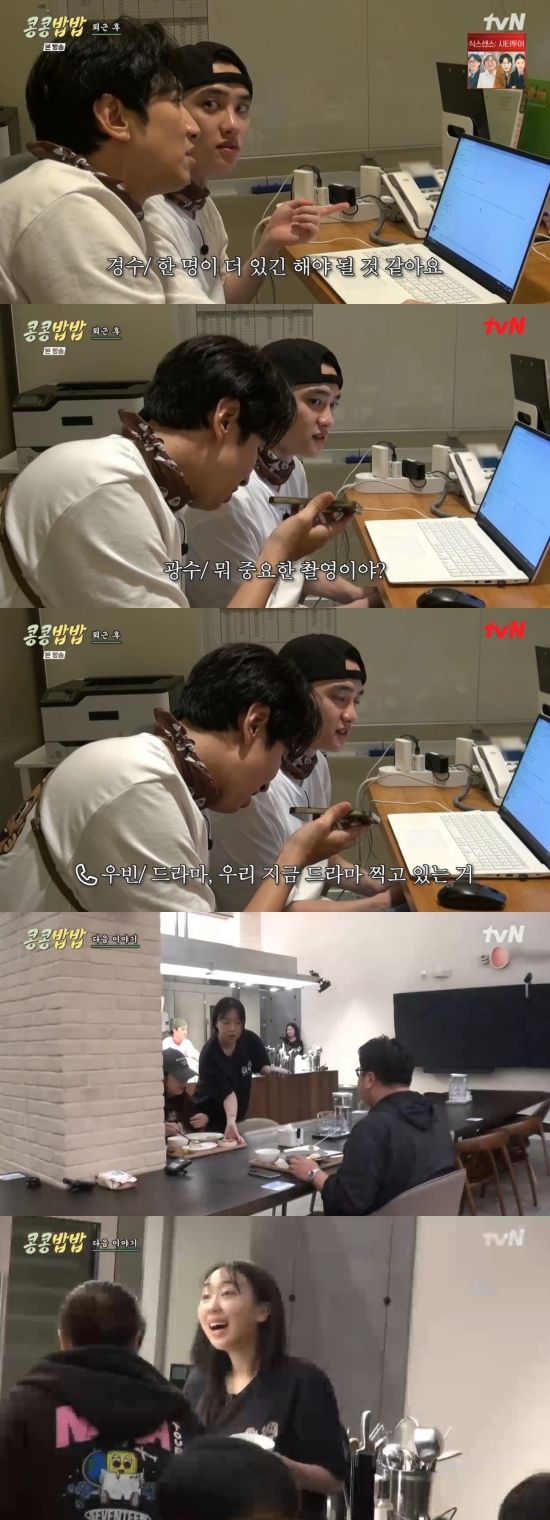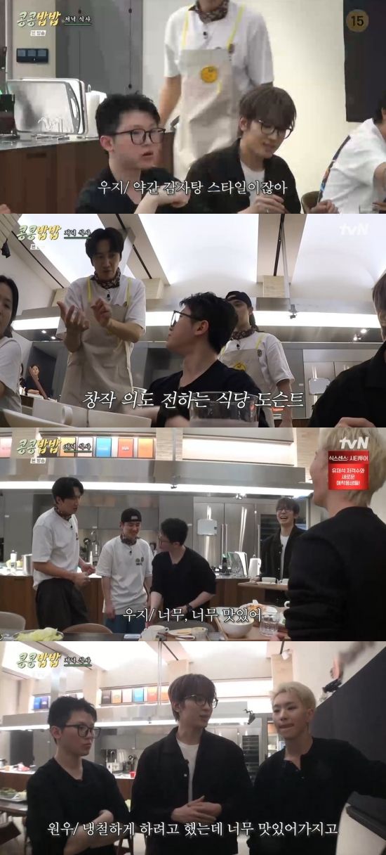 15일 방송된 tvN '콩 심은 데 콩 나고 밥 먹으면 밥심 난다'(이하 '콩콩밥밥')에서는 호시, 원우, 우지가 도경수와 이광수가 운영하는 구내식당에서 식사하는 장면이 전파를 탔다.