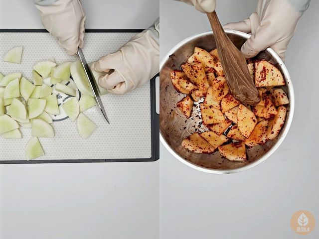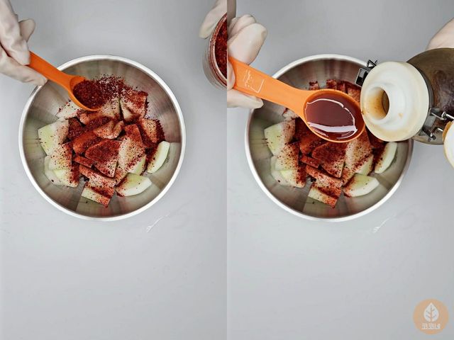 손질한 무에 고춧가루2, 매실액1 넣고 잘 버무려주세요.