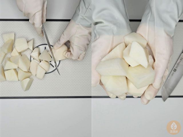 첫번째 무를 적당한 크기로 숭덩숭덩 썰어주세요.