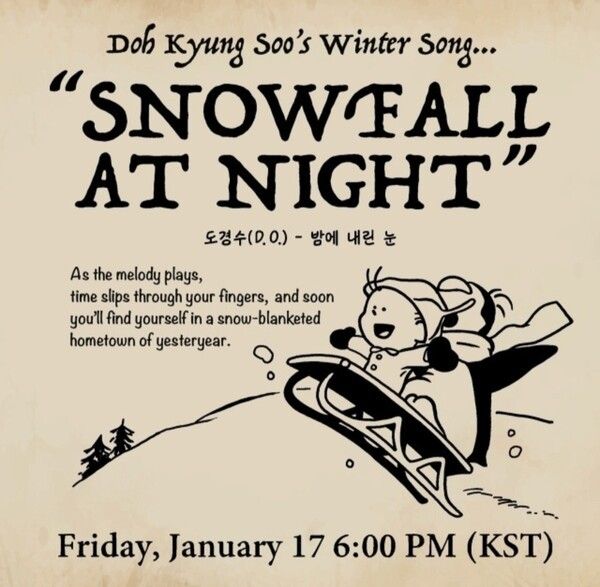 도경수는 지난해 미니 3집 ‘성장’ 발매에 이어 아시아 팬콘 투어, 컬래버 음원, 드라마 촬영, 유튜브 및 예능 출연, 광고 등 다양한 분야에서 활약했다. 그 누구보다 바쁜 한 해를 보냈던 도경수는 이번 신곡 ‘밤에 내린 눈’을 시작으로 다시 한번 ‘열일’ 행보를 이어 나갈 예정이라 벌써 많은 이들의 관심이 쏠리고 있다.