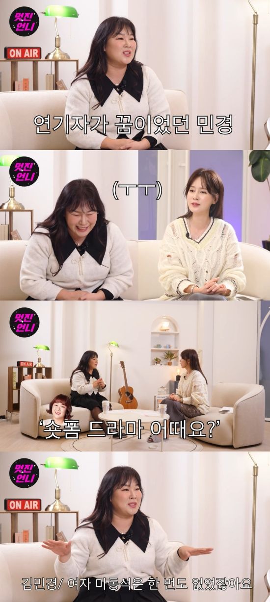 김민경은 "사실 어릴 때부터 꿈은 연기자였다. 그런데 사람들이 '너는 개그우먼이 맞다'고 했었다"면서 "요즘 숏폼이 대세인데, 그래서 회사 대표님한테 숏폼 드라마 만들어보는 게 어떻겠냐고 말했다. 그랬더니 '여자 마동석 어때요?' 하더라"고 입을 열었다.