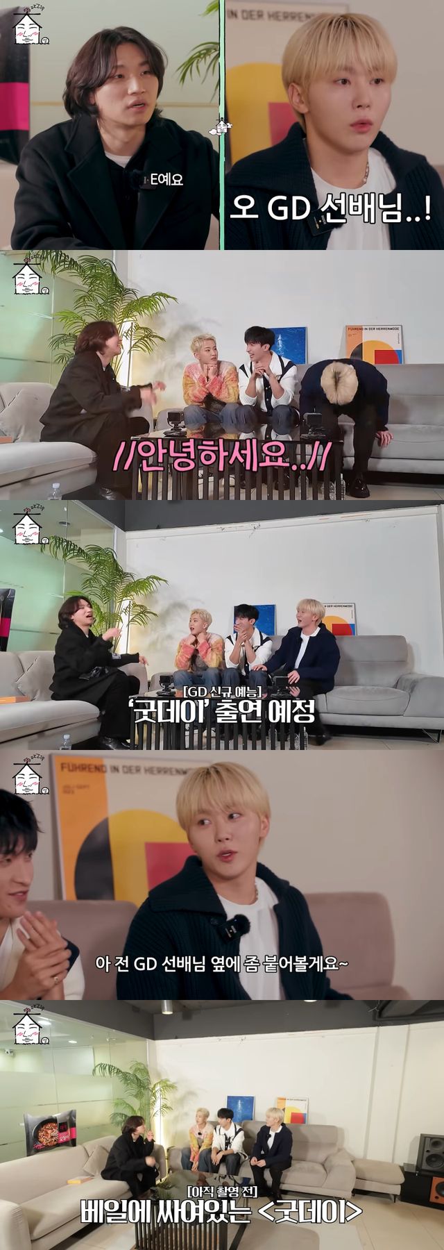 호시는 김태호 PD가 연출하고 지드래곤이 출연하는 MBC 새 예능 ‘굿데이’ 촬영에 대해 언급했다. 승관은 “지드래곤 선배님 옆에 붙어보겠다”고 말하자 대성은 “근데 E라고 나처럼 이렇게 잘 보듬어주지 않을 것”이라고 얄밉게 대답했다.