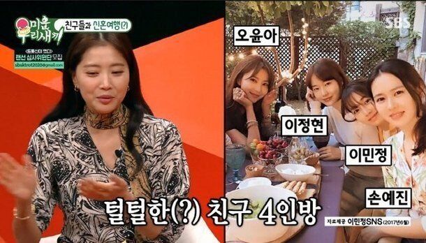 이정현 씨 신혼여행을 따라갔다고 들었다”고 운을 떼자 오윤아는 “이정현 씨가 가자고 해서 저희가 그냥 그걸 문 것 뿐이예요. 손예진 이민정 오윤아 같이 가게 된거예요. 너무너무 잘 놀았어요”라고 말했다.