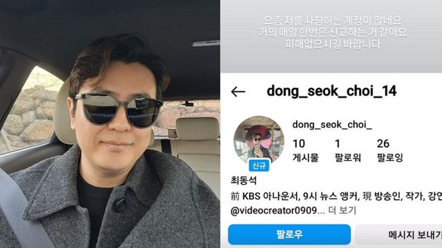 이어 그는 “거의 매일 한 번은 신고하는 것 같다. 피해없으시길 바란다”라고 전했다. 공개된 사진에는 최동석의 사진과 아이디를 이용해 유사하게 사칭 계정의 모습이 담겼다. 소개란에는 ‘前 KBS 아나운서 9시 뉴스 앵커, 現 방송인’이라고 적혀 있어 눈길을 쏠렸다.