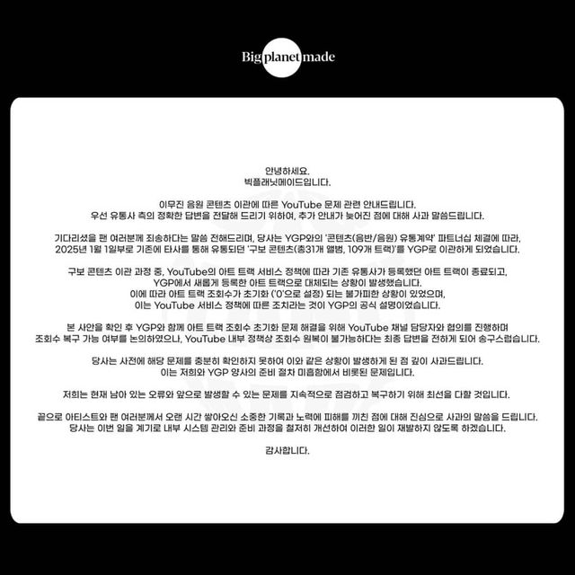 빅플래닛메이드 측은 "아티스트와 팬 여러분께서 오랜 시간 쌓아오신 소중한 기록과 노력에 피해를 끼친 점에 대해 진심으로 사과의 말씀을 드린다. 당사는 이번 일을 계기로 내부 시스템 관리와 준비 과정을 철저히 개선하여 이러한 일이 재발하지 않도록 하겠다"고 고개 숙였습니다.