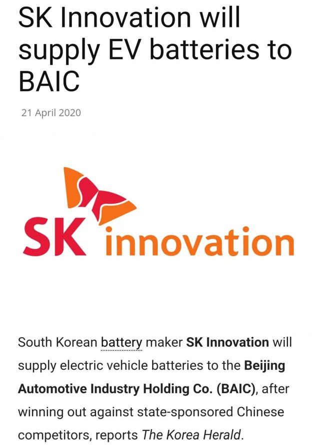 짭르쉐로 유명한 아크폭스 등 베이징자동차의 고급 전기차 브랜드는 SK ON에서 배터리를 공급받고