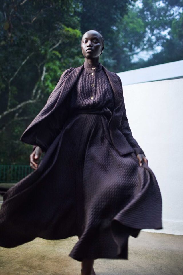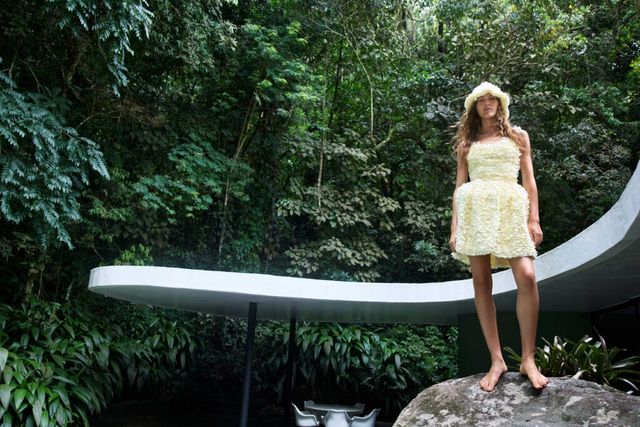 컬렉션의 포인트 컬러는 자연에서 영감을 받은 어스톤 팔레트로 구성되었습니다. 이 색상들은 카사 다스 카노아스의 모던한 건축 디자인과 대조를 이루면서도, 배경과 자연스럽게 어우러지는데요. 이번 캠페인에는 카사 다스 카노아스 주변에 설치된 조각품도 함께 등장합니다. 알프레도 세치아티(Alfredo Ceschiatti)와 베라 토레스(Vera Torres)의 조각품은 건축적 요소가 빚어내는 조화로운 미학을 강조하고 있죠.