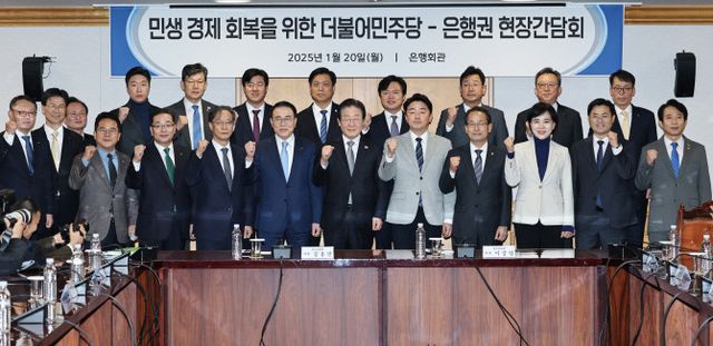 이재명 더불어민주당 대표가 20일 서울 중구 전국은행연합회에서 열린 '민생 경제 회복을 위한 더불어민주당-은행권 현장간담회'에 앞서 조용병 전국은행연합회장 및 참석자들과 기념 촬영을 하고 있다. ⓒ 연합뉴스