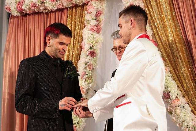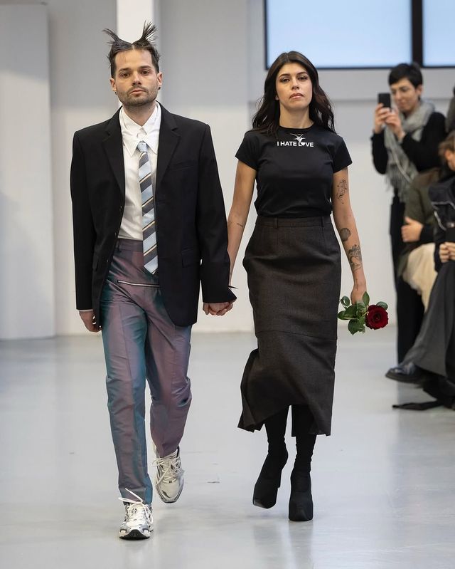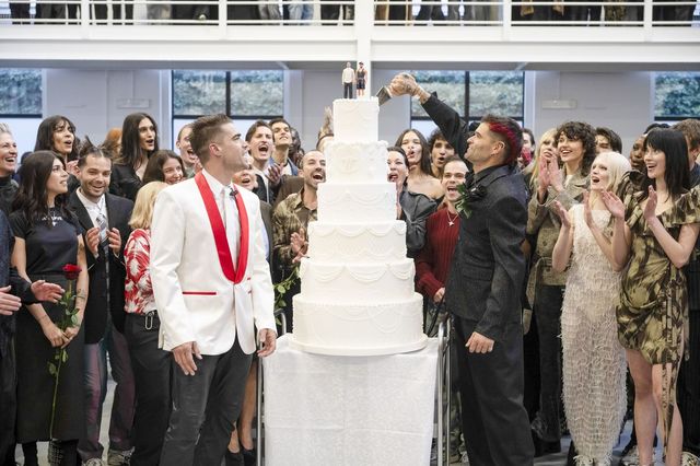 쇼가 시작되자 런웨이 위로는 'I Hate Love'가 적힌 티셔츠, 어딘가 삐딱한 하객 룩과 함께 손에 들린 장미 등 기존의 정숙한 결혼식 문법을 파괴하는 피스들이 연이어 등장했죠. 두 사람의 실제 가족, 친구들이 모델로 나선 이번 쇼는 세상에 존재하는 다양한 형태의 사랑을 축복하는 자리였습니다. 캣워크가 막을 내린 뒤 둘은 사랑하는 사람들 앞에서 결혼 서약을 마치고, 함께 케이크를 자르며 더없이 특별한 날을 축복했죠.