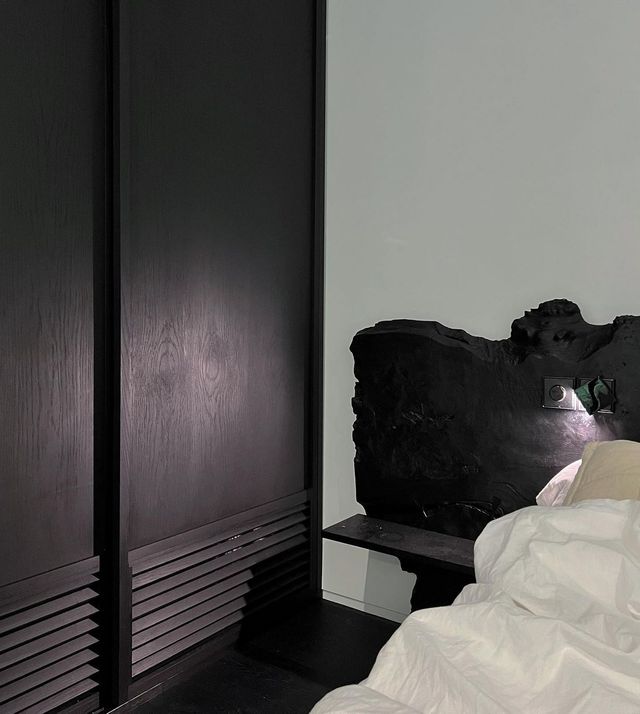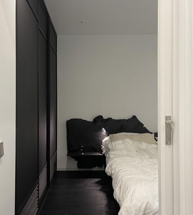 침실에 설치한 짙은 블랙 컬러의 옷장과 침대 프레임은