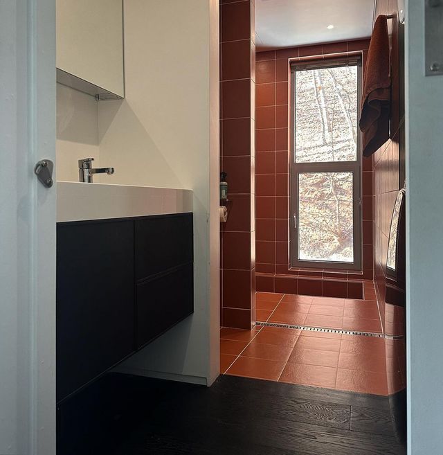타일 매장에서 벽돌색 타일을 보고 꽂혀서 욕실은 이 자재가 메인이 되었고요. 이 타일의 매력이 돋보여지도록 나머지 부분들을 조율하며 그때그때 자연스럽게 선택하다 보니 사진 속 결과물이 완성되었네요.
