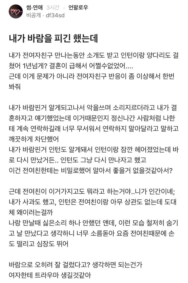 내가 바람을 피긴 했는데..전여친 반응이 좀 이상해