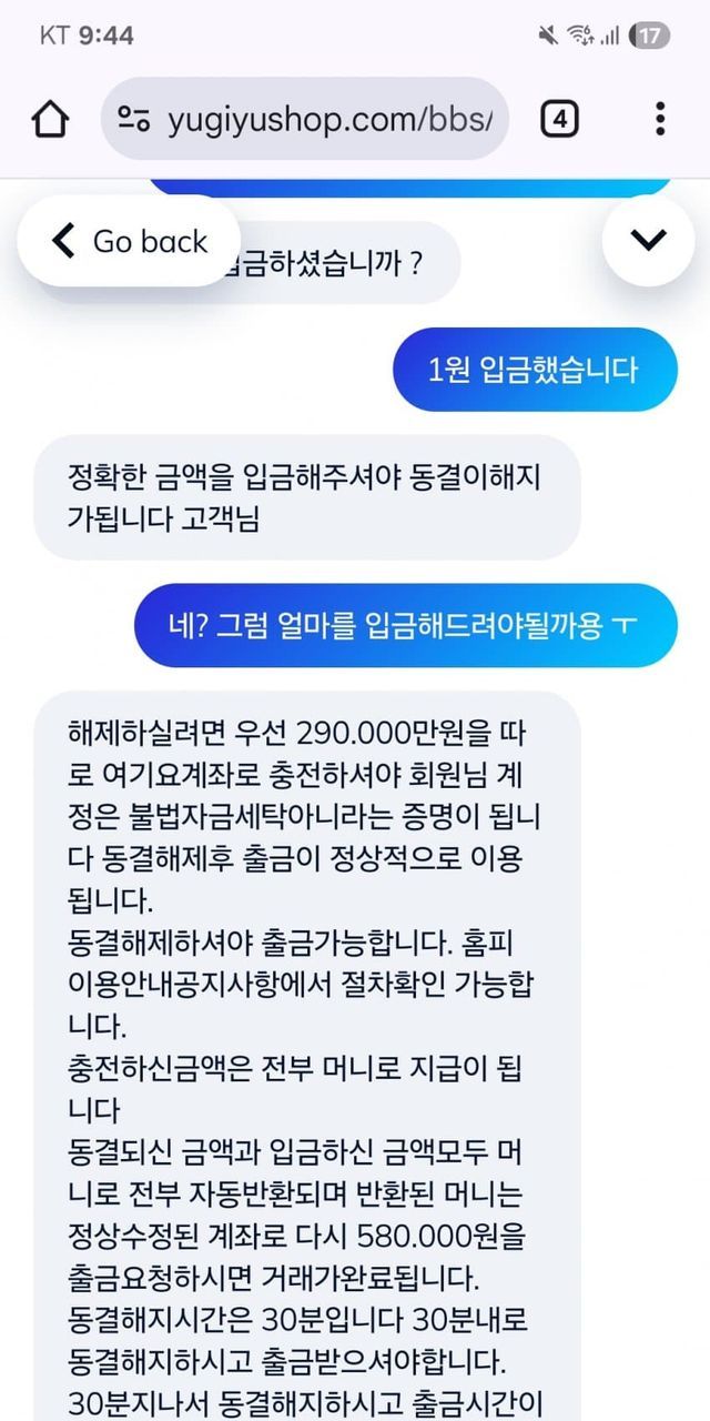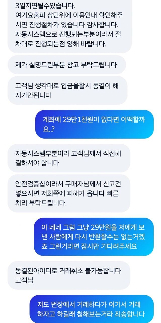 그러나 판매금을 자신의 계좌로 입금받으려 하니 문제 의 사이트 상담원으로부터 '계좌번호가 동결됐다. 판매 금액만큼의 돈을 입금해야지 동결을해제할 수 있다'는 안내를 온라인 채팅을 통해 받았습니다.