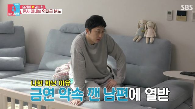이를 들은 슬리피는 "가끔 핀 거다. 계속 피운 건 아니다"라고 흡연 사실을 실토했다. 하지만 아내 김나현은 "이제 둘째도 태어날 거라 신생아가 또 생기는데 앞으로도 몰래 계속 담배 피울거냐. 건강관리 해야 할 거 아닌가. 담배 걸린 게 처음이 아니다"라고 답답함을 토로했다.