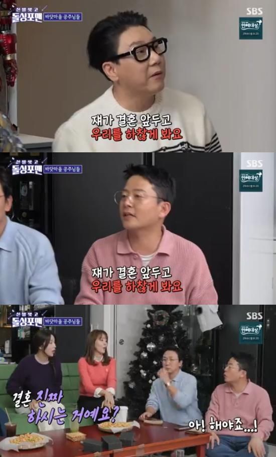 김준호는 한혜진, 홍은희, 박하선 앞에서 '돌싱포맨' 멤버들을 놀렸고, 이에 이상민은 "(김준호가) 결혼을 앞두고 우리를 하찮게 본다"고 목소리를 높였다.