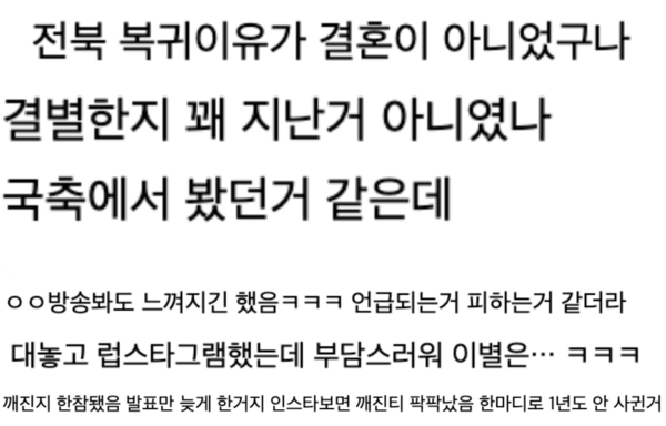 그러나 최근 송범근이 전북 현대에 복귀하면서 두 사람의 관계가 더욱 발전할 것이라는 전망이 있었으나, 오히려 결별설이 불거져 많은 팬들이 의아해하고 있다.