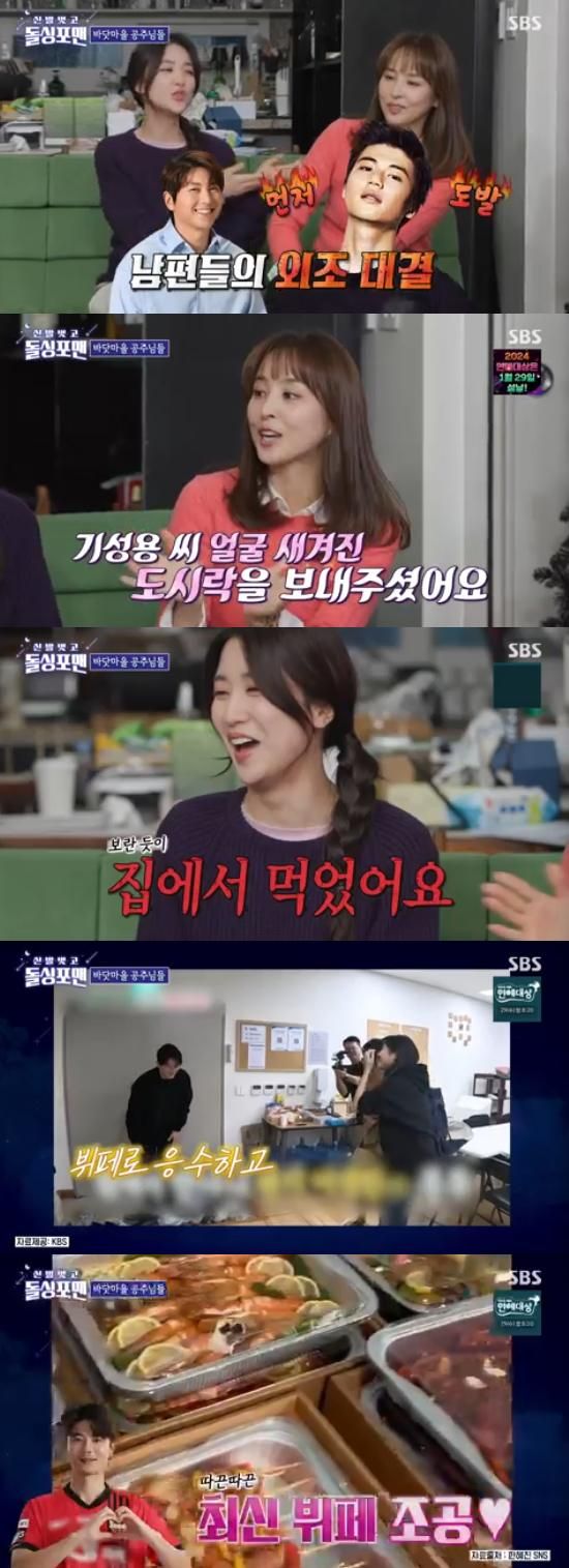 박하선은 "(기성용이) 먼저 시작하셨다. (기성용) 얼굴이 박힌 도시락을 보내주셨더라. 그래서 일부러 집에 가져가서 먹었따"고 했고, 이를 들은 한혜진은 "그랬더니 그 다음에 (류수영이 보낸) 뷔페가 차려지더라"고 말해 웃음을 자아냈다.