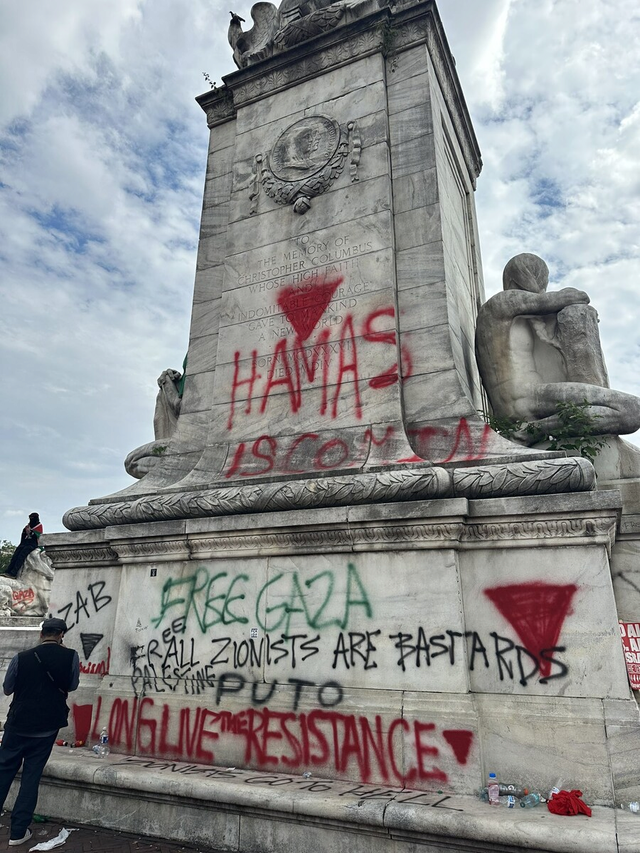 친팔레스타인 시위대가 성조기 3개를 모두 끌어내리고 팔레스타인 깃발로 교체 성조기는 불태움 ㄷㄷ 1970년에 만든 자유의 종에 낙서 깃대 앞 모뉴먼트에선 하마스라 낙서