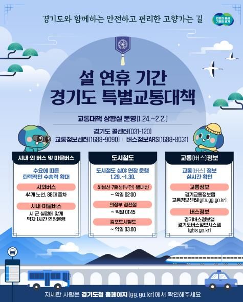 도는 먼저 시외버스의 경우 5개 권역에 44개 노선 88대를 증차하고 운행횟수를 138회 증회한다. 시내·마을버스는 필요시 시군 자체 실정에 맞춰 1시간 연장 운행 등 탄력적으로 운영한다. 도시철도는 하남선과 7호선(부천 구간), 별내선은 1월 29일부터 30일까지 2일간 익일 오전 2시까지, 의정부 경전철은 익일 오전 1시 45분까지, 김포도시철도는 익일 오전 3시까지 심야 연장 운행한다.