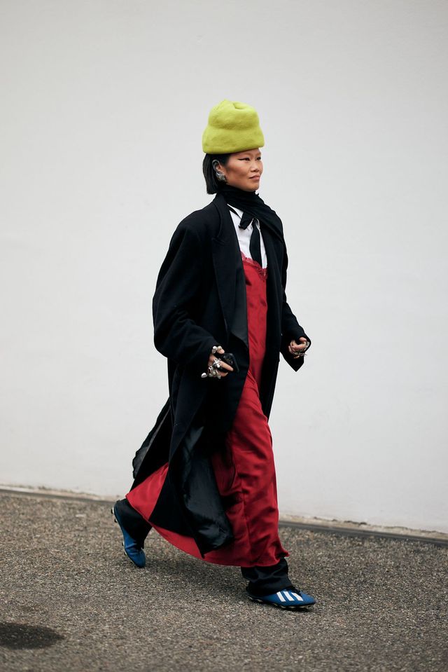 마치 머리 위에 소프트아이스크림을 얹은 듯, 잘 빚은 헤드 피스를 연상케 하는 모자가 레드 실크 슬립 드레스와 매스큘린한 블랙 앤 화이트를 만나 신선한 매력을 뽐내네요.
