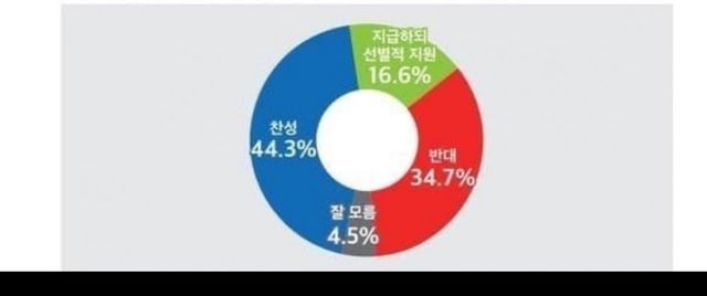 여론조사 전문기관 <미디어토마토>가 <뉴스토마토> 의뢰로 지난 4월 27~28일 전국 만 18세 이상 1003명 대상으로 실시한 조사에서 ‘전국민 긴급 지원을 통해 경제효과를 극대화할 수 있으므로 찬성한다(찬성)’는 답변이 44.3%, ‘물가 인상을 부추기고 국가재정에 부담이 되므로 지원금 지급에 반대한다(반대)’는 답변은 34.7%, ‘지원금을 지급하되 취약계층에게만 선별적으로 지원해야 한다(선벌지원)’는 의견은 16.6%로 나타나 전 국민 지원금은 아니더라도 현 경기침체 등에 대비하기 위한 지원금 지급 정책이 취해져야 한다는 의견이 무려 60.9%에 달하는 셈이다.