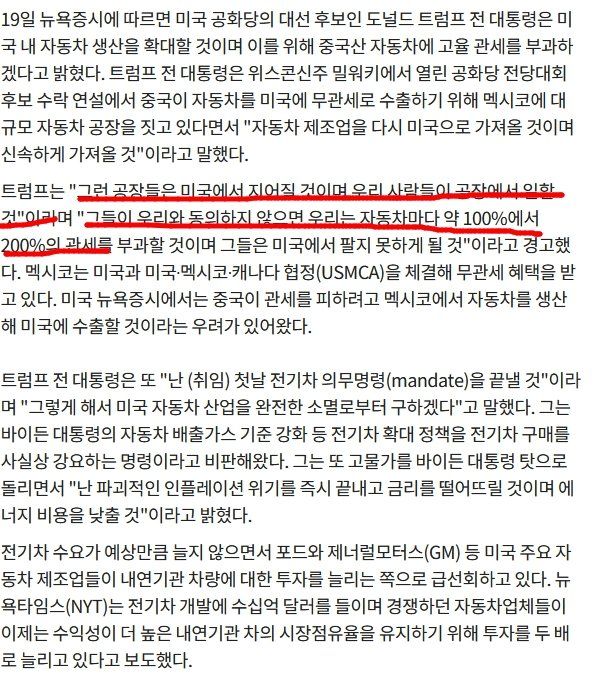 중국자동차 멕시코 우회생산만 그런줄 알았더니 무조건 미국내 생산 아니면 관세 200% 때림. 멕시코와 협정 개무시