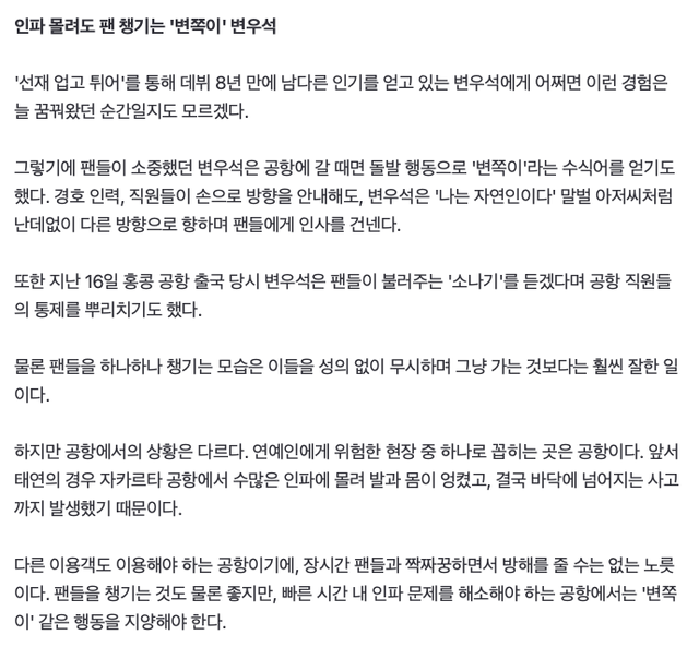 평소에 공항에서 팬서비스 한다고, 경호원 가이드 무시하고 이탈해서 인사해준다고 ‘변쪽이’라는 별명으로 유명