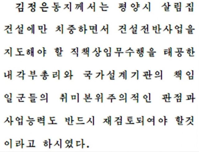 “최근 몇년간에 김덕훈 내각의 행정경제 규율이 극심하게 문란해졌다. 건달뱅이들이 무책임한 일본새로 국가경제사업을 다 말아먹고있다.”