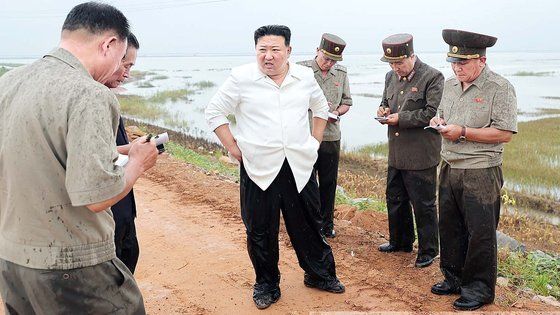 작년 8월, 평안남도 침수 피해 현장을 찾아 김정은이 김덕훈에게