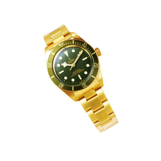 빈티지한 올리브 그린 다이얼과 새틴 마감한 18K 옐로골드의 조합이 돋보이는 블랙 베이 58 워치는 4천6백13만원,