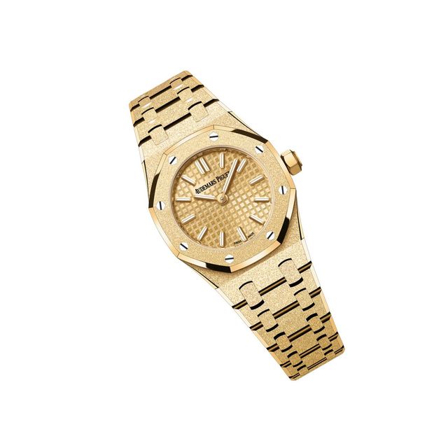 케이스와 브레이슬릿, 인덱스와 핸즈에도 옐로골드를 사용한 직경 23mm 크기의 로얄 오크 미니 프로스티드 골드 쿼츠 워치는 5천21만원,