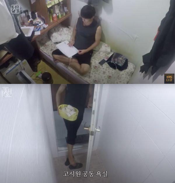 혼자 사용하기에 폭이 넉넉한 화장실. 두 발을 뻗을 수 있는 매트리스와 TV, 그리고 난방이 제공된다. 무엇보다, 널찍한 창 사이로 눈부시게 들이치는 햇살…. 그게 뭐 어쨌냐고? 세상의 많은 고시원과 반지하 생활자들은 감히 꿈꿔보고 요구해본 적 없는 순간이 하필 화면엔 잡혀 있었다. 고시원 유랑자들에게 ‘창문과 햇살의 유무’, ‘화장실의 독립성과 크기’란 ‘고급 옵션’의 장이기 때문이다. 이에 따라 5~10만 원의 월세 차이가 난다. 만약 이 ‘대기실’의 창살을 지운 사진을 ‘고시원 앱’에 현물로 올린다면 얼마일까. 적은 돈으로 방을 구하던 이들이 가격을 보고 놀라 ‘뒤로 가기’를 누르진 않았을까.