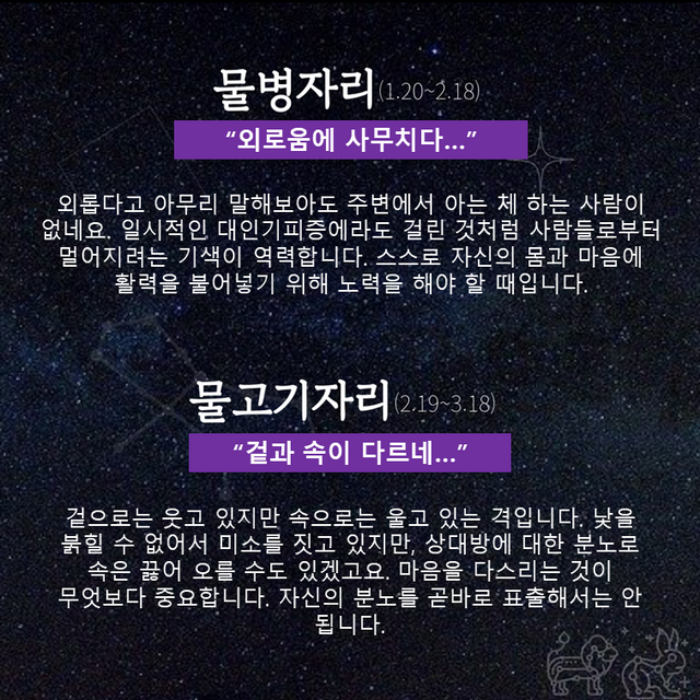 외롭다고 아무리 말해보아도 주변에서 아는 체 하는 사람이 없네요. 일시적인 대인기피증에라도 걸린 것처럼 사람들로부터 멀어지려는 기색이 역력합니다. 스스로 자신의 몸과 마음에 활력을 불어넣기 위해 노력을 해야 할 때입니다.