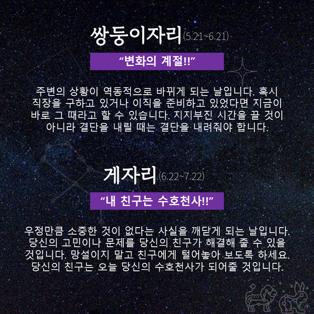 특히 애정운에 있어서 변화가 심한 때가 될 것입니다. 싱글인 분이라면 좋은 인연이 들어올 수 있는 하루이니 준비를 해두는 것이 좋습니다. 커플인 분에게도 애정운이 나쁜 것은 아니지만 삼각 관계의 위험성이 있으니 주의가 필요합니다.