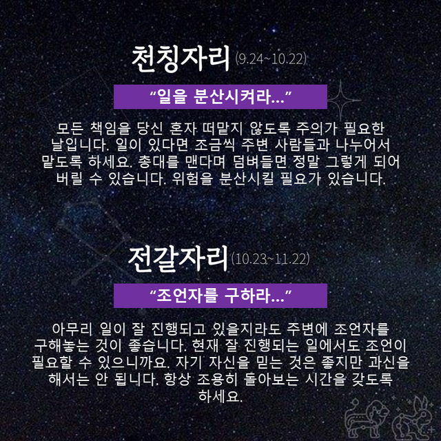 모든 책임을 당신 혼자 떠맡지 않도록 주의가 필요한 날입니다. 일이 있다면 조금씩 주변 사람들과 나누어서 맡도록 하세요. 총대를 맨다며 덤벼들면 정말 그렇게 되어 버릴 수 있습니다. 위험을 분산시킬 필요가 있습니다.