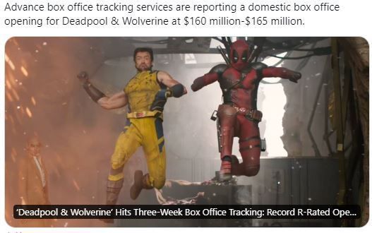 사전 박스오피스 추적 서비스에 따르면 ‘데드풀과 울버린’은 첫주 북미에서 1억6천~1억6천5백만불 흥행을 예측,,이는 올해 최고 흥행 개봉작일 뿐 아니라 R등급 영화 중 최고 기록이라고..