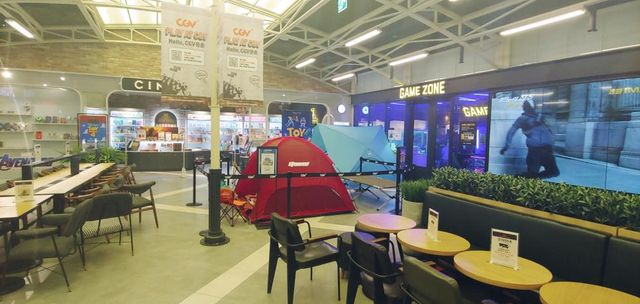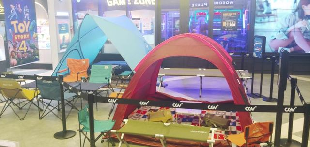 CGV로비 한가운데 텐트 설치해놓고
