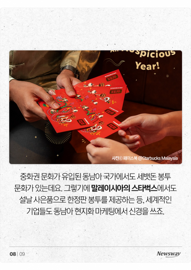 중화권 문화가 유입된 동남아 국가에서도 세뱃돈 봉투 문화가 있는데요. 그렇기에 말레이시아의 스타벅스에서도 설날 사은품으로 한정판 봉투를 제공하는 등, 세계적인 기업들도 동남아 현지화 마케팅에서 신경을 쓰죠.